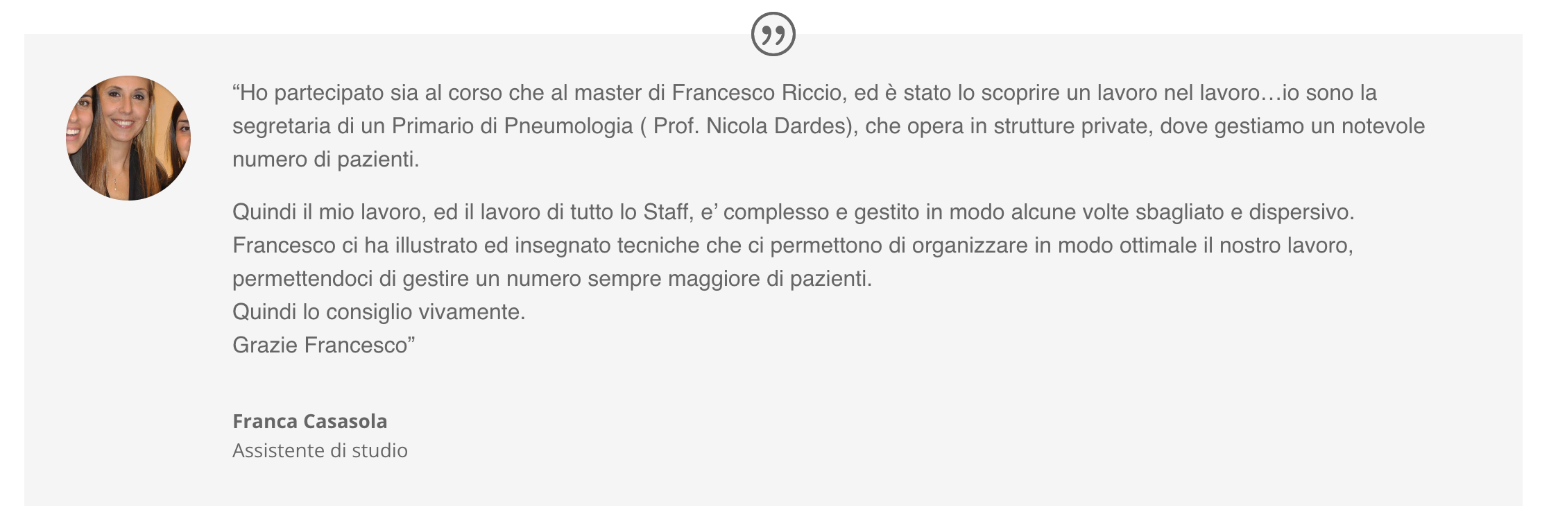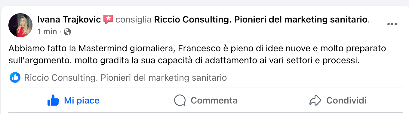 Ecco le opinioni dei tuoi colleghi su Francesco Riccio, sul Corso Vendere Salute™ e sui percorsi della Riccio Consulting™.